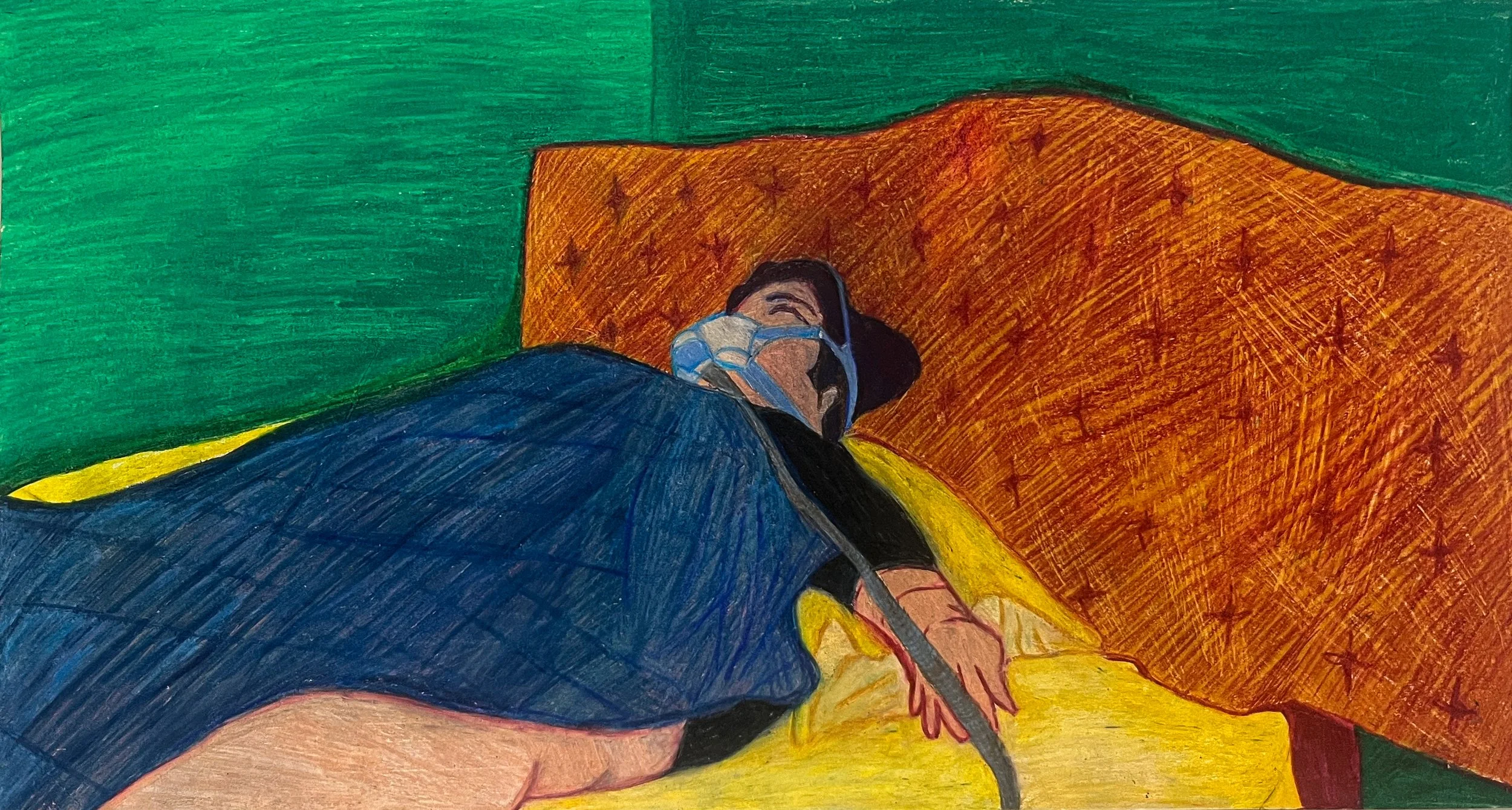 Snore no more (2024), 9 × 16 inches, colored pencil