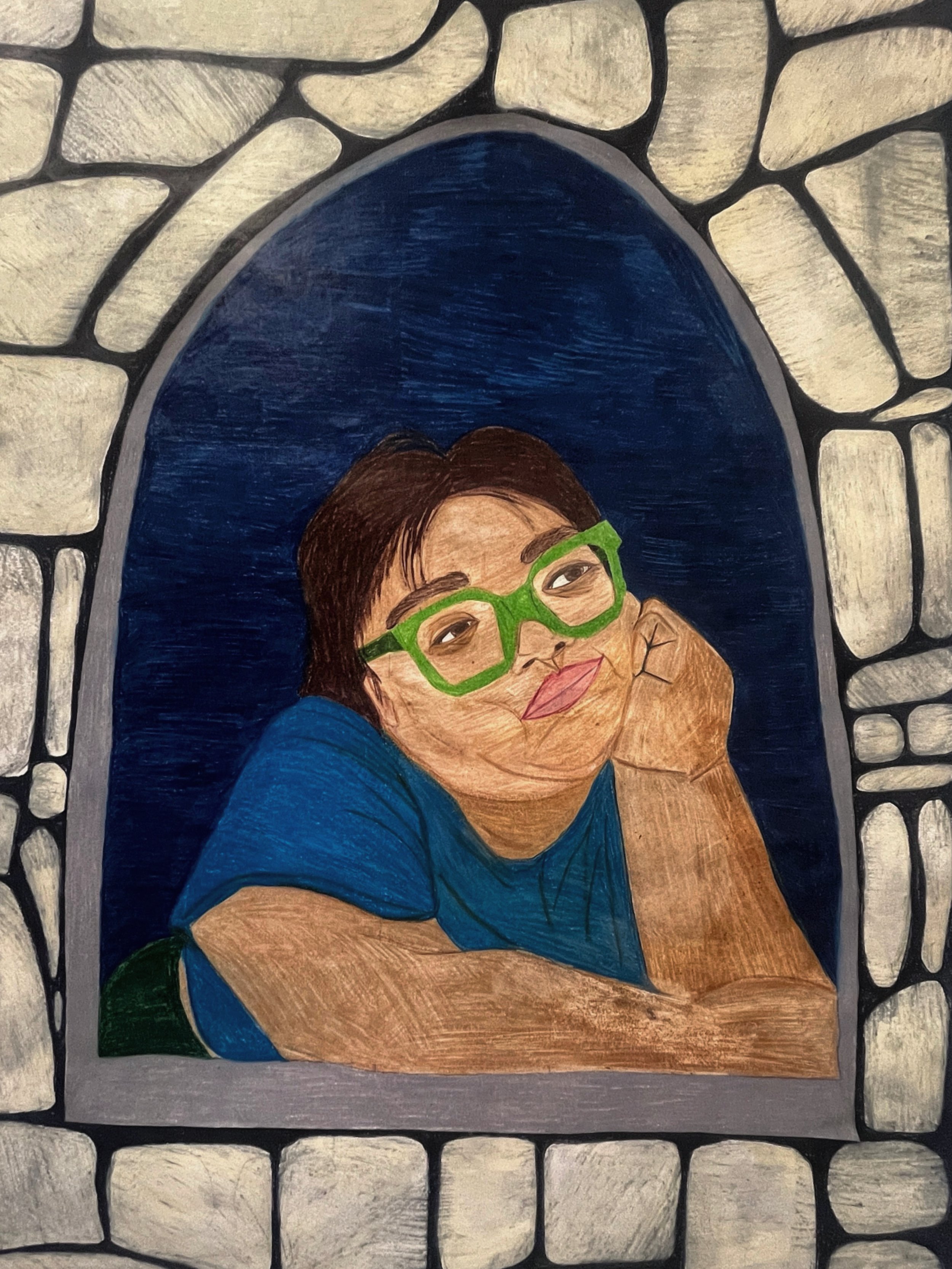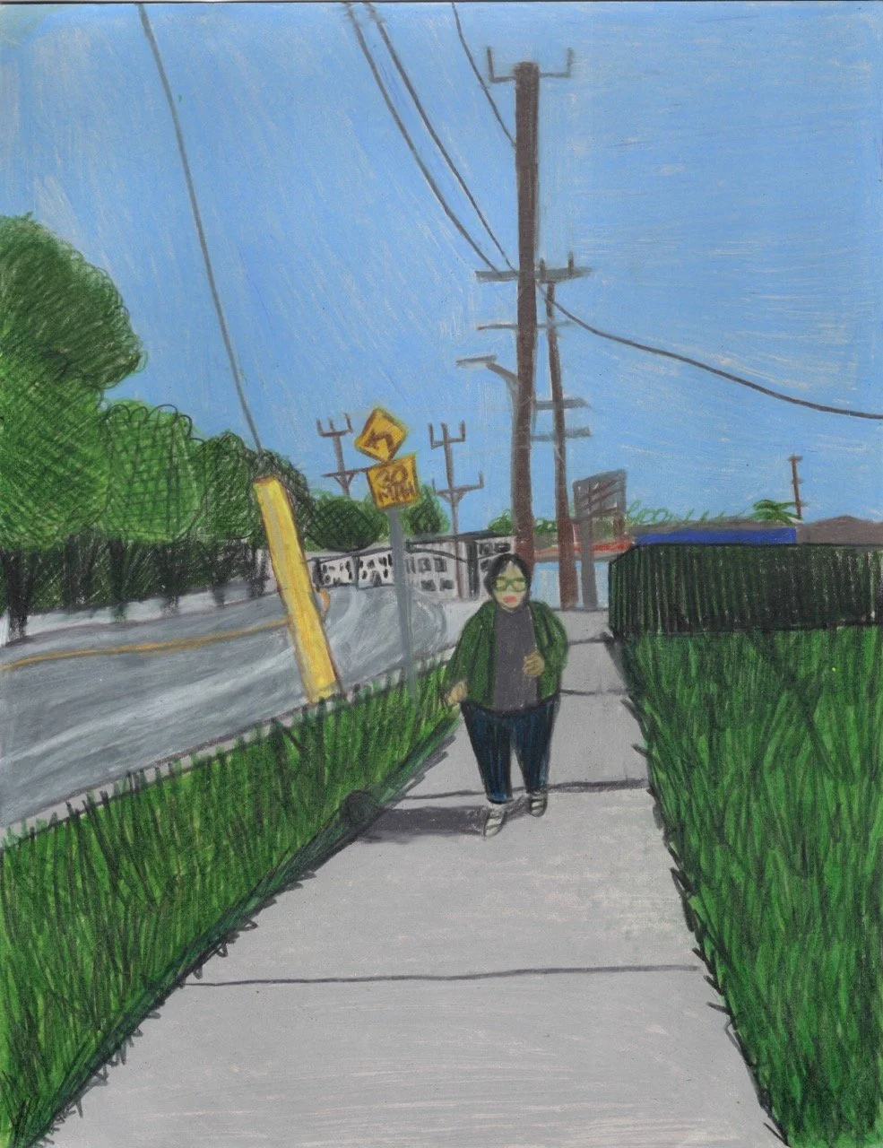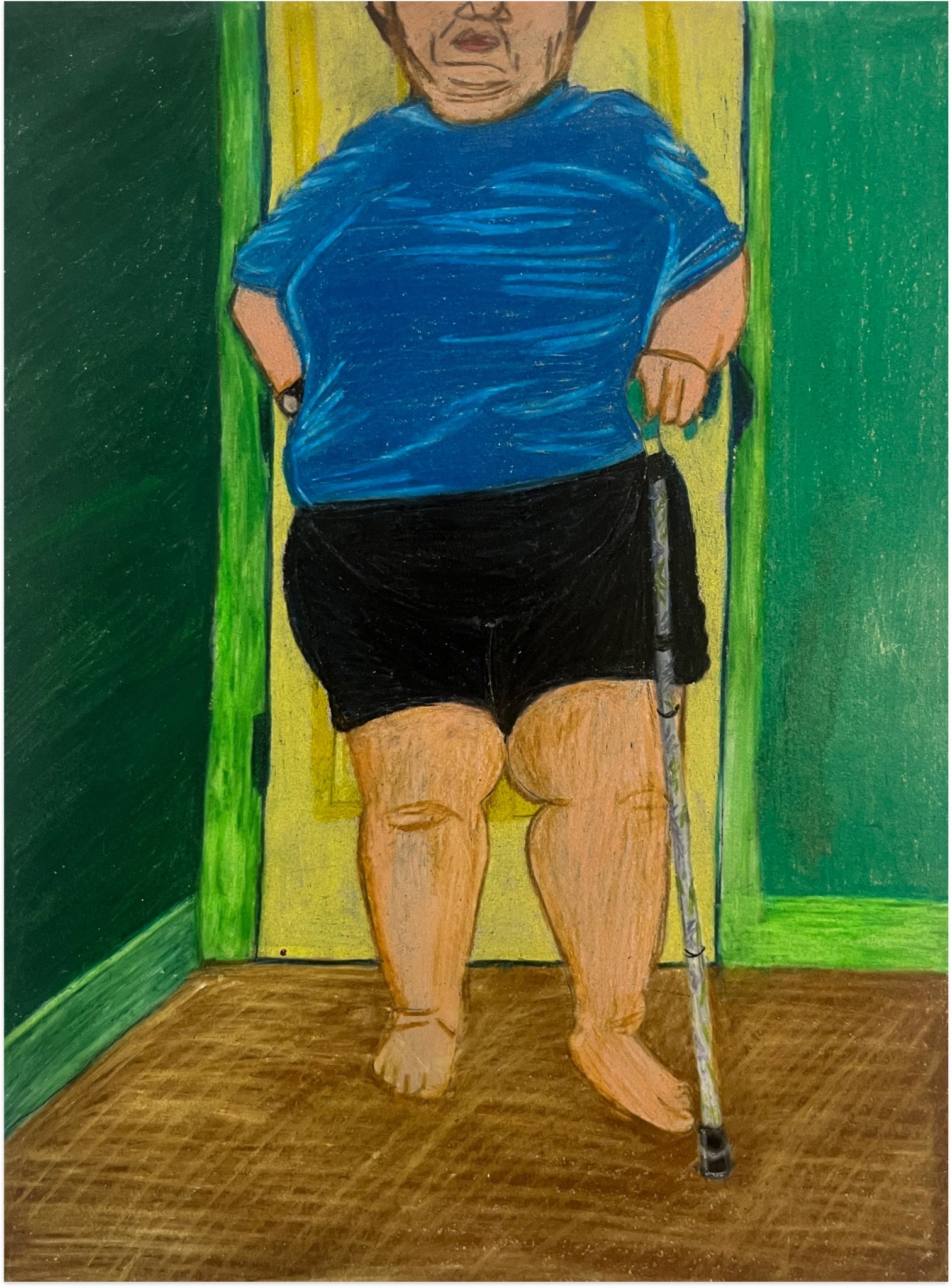 My cane and I (2024), 9 × 12 inches, colored pencil