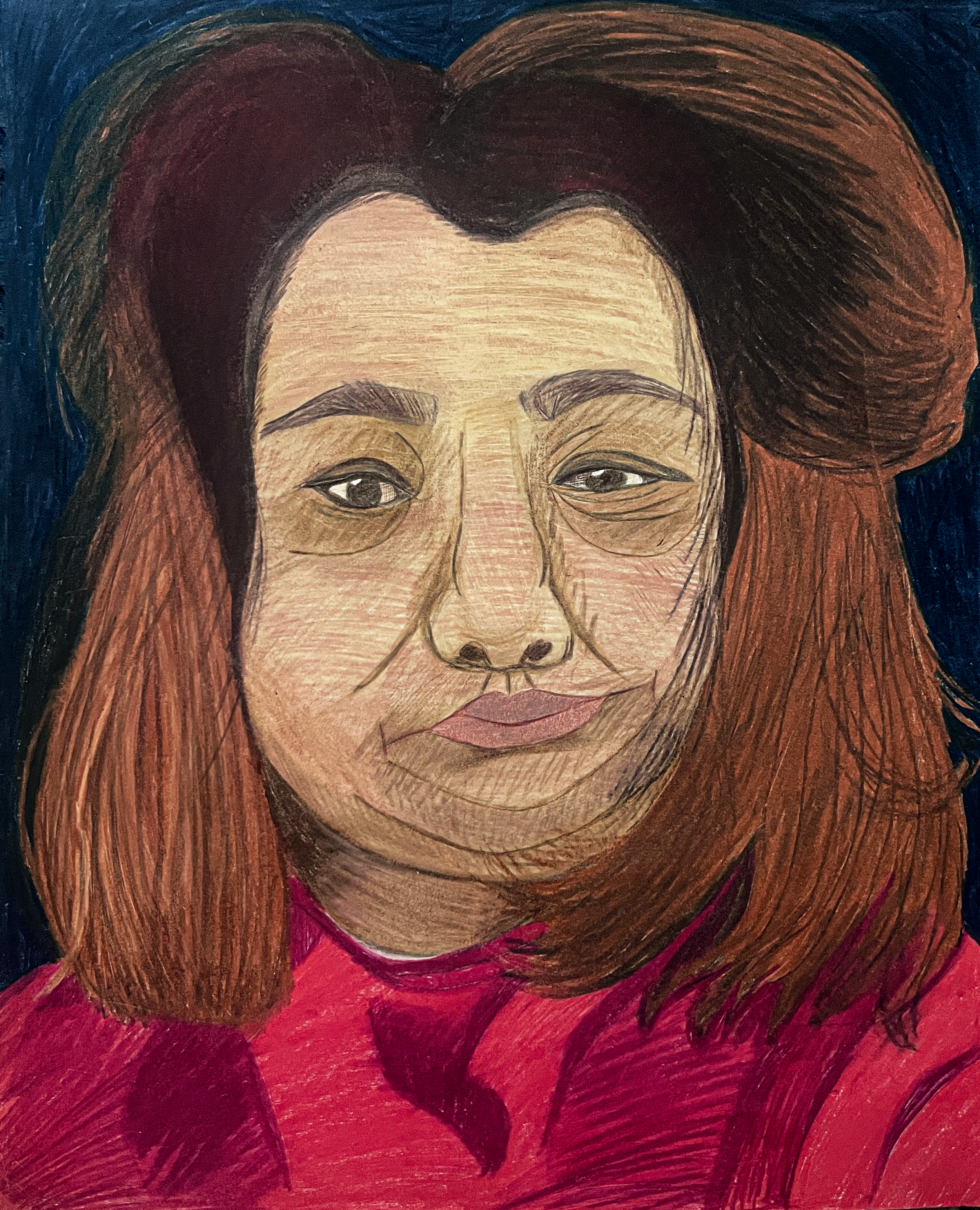 The people who love me also erase me (2025), colored pencil, charcoal, and chalk pastel, 42 × 24 inches