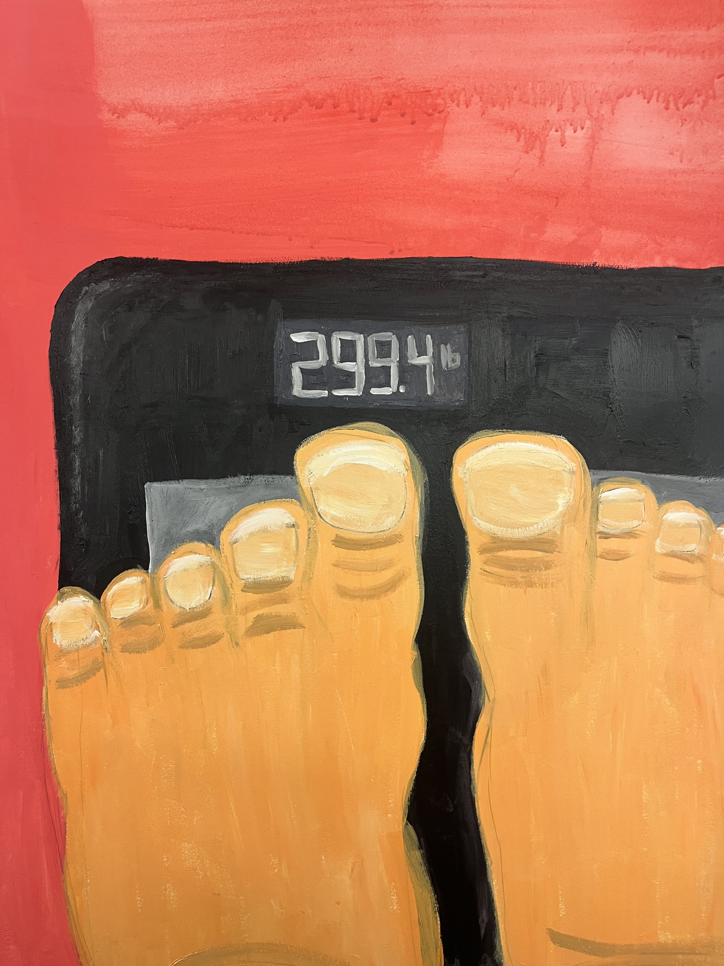 Weigh scale (2025), acrylic paint on watercolor paper, 22 × 30 inches